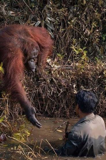 Um orangotango foi visto estendendo uma das mãos a um homem que o animal "pensava estar em perigo" por se encontrar em um rio frequentado por cobras.