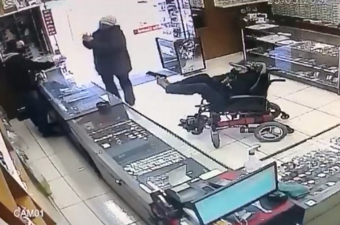 O que parecia ser um assalto inusitado já que o rapaz que entregou o bilhete estava em uma cadeira de rodas elétrica e é mudo, é que rapidamente ele puxou uma pistola e começou a manusear com os pés, já que tem os movimentos das mãos limitados devido a deficiência, apontando a arma para o comerciante.